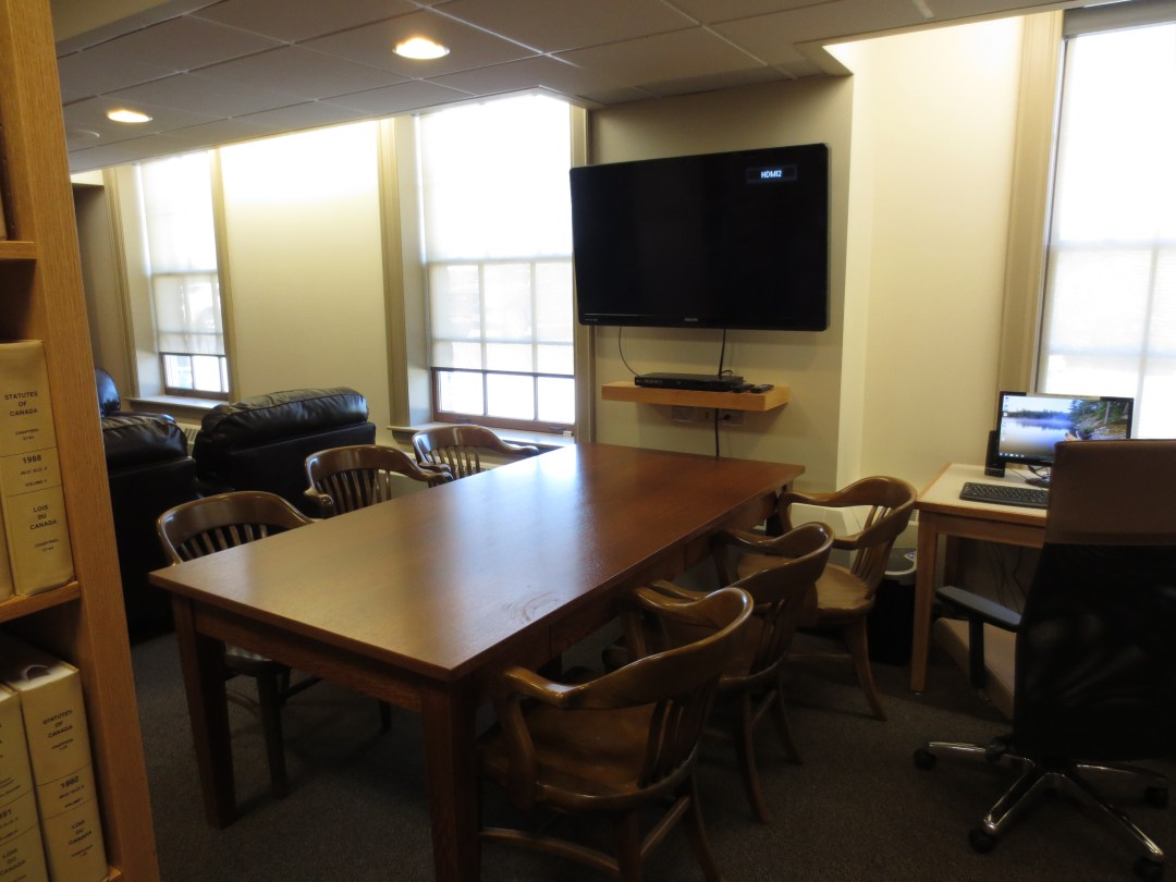 Facility: The library has seating space for 12-15, including work tables.  There is a TV, DVD player, lawyer accessible computer workstation, printer, scanner and fax. A client interview room is adjacent to the law library.